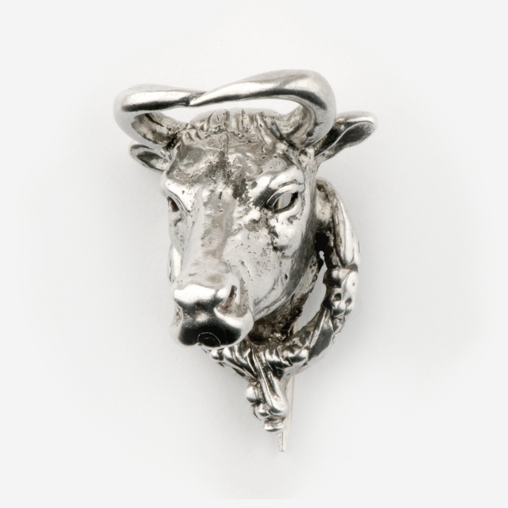 Horned cow door knocker. Elegant and realistic carving with ornate knocker almost like a garland celebrating the cow.