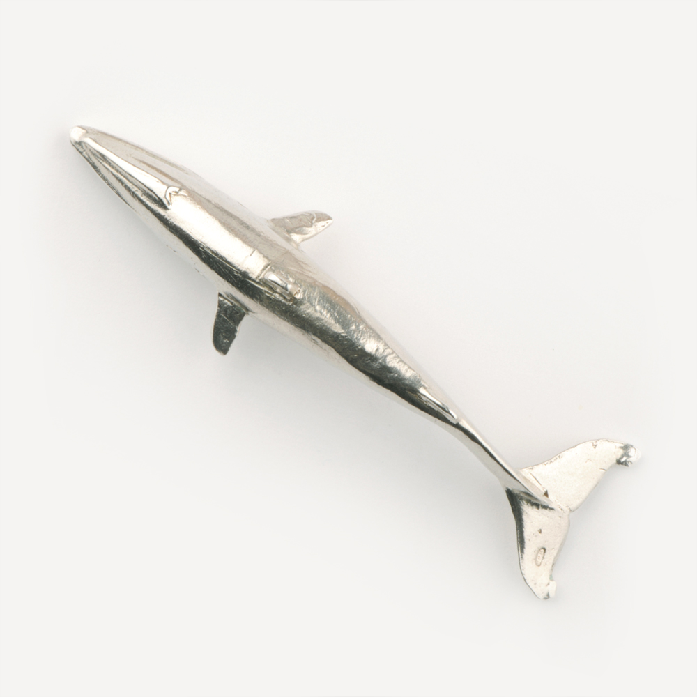 Solid silver 3D blue whale depicted with the gentle curve of being in motion. It echoes the true majesty of this mammal.