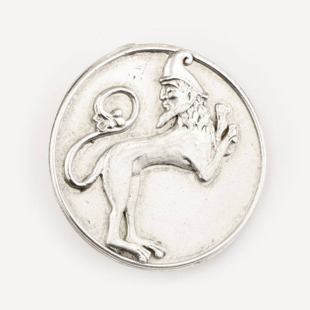 Manticora in a coin, heavy and bold. The manticora is a legendary creature of Middle East/East, with the body of a lion and a human head.