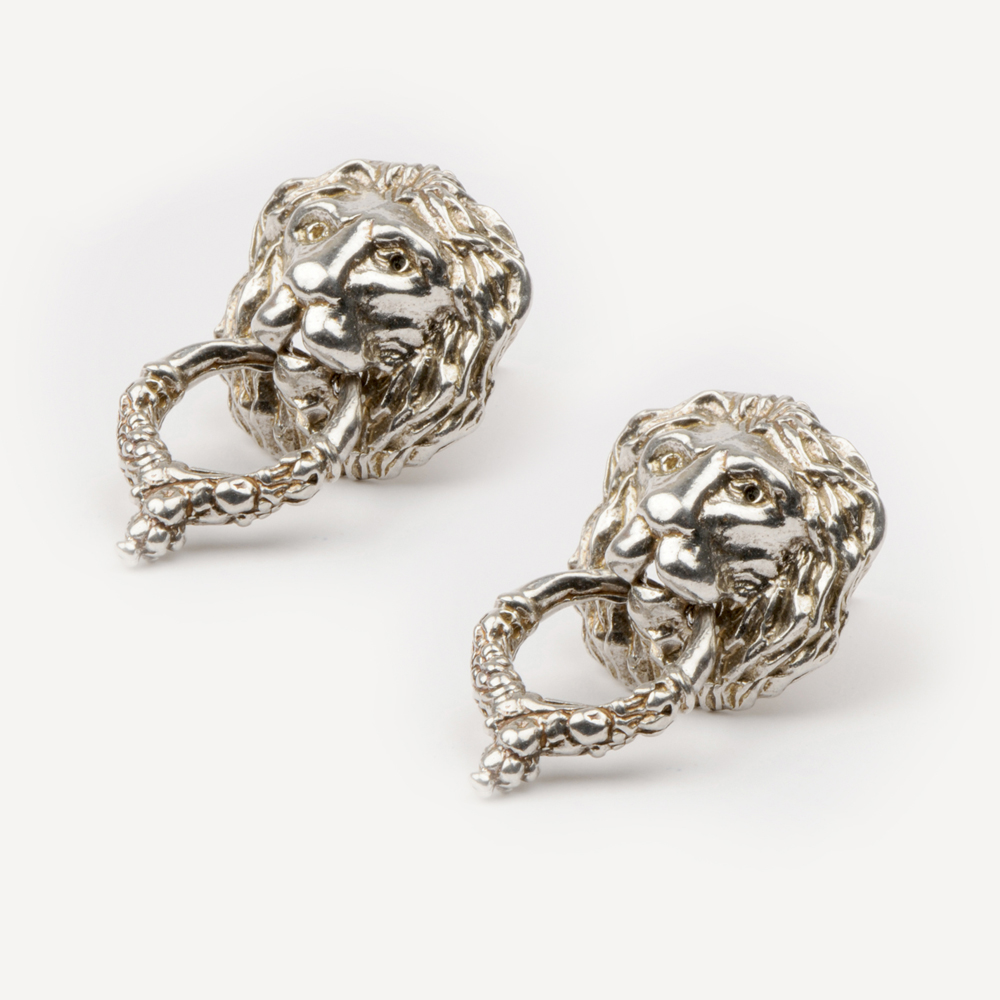 Lion door knockers in the style of the Georgian period. Michael Burton would often be seen wearing one set with a Sri Lankan moonstone in the knocker.